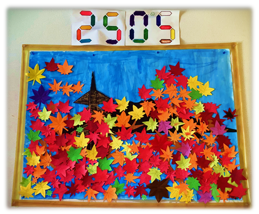 背景には静かに佇むお寺と、お山を描き、そこに皆さんが思い思いの紅葉を貼ってくださいました。
