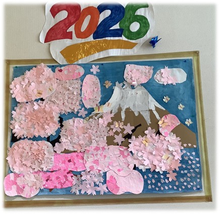 壁画には、雄大な富士山を背景に大きな桜が優しく囲うように咲いています。